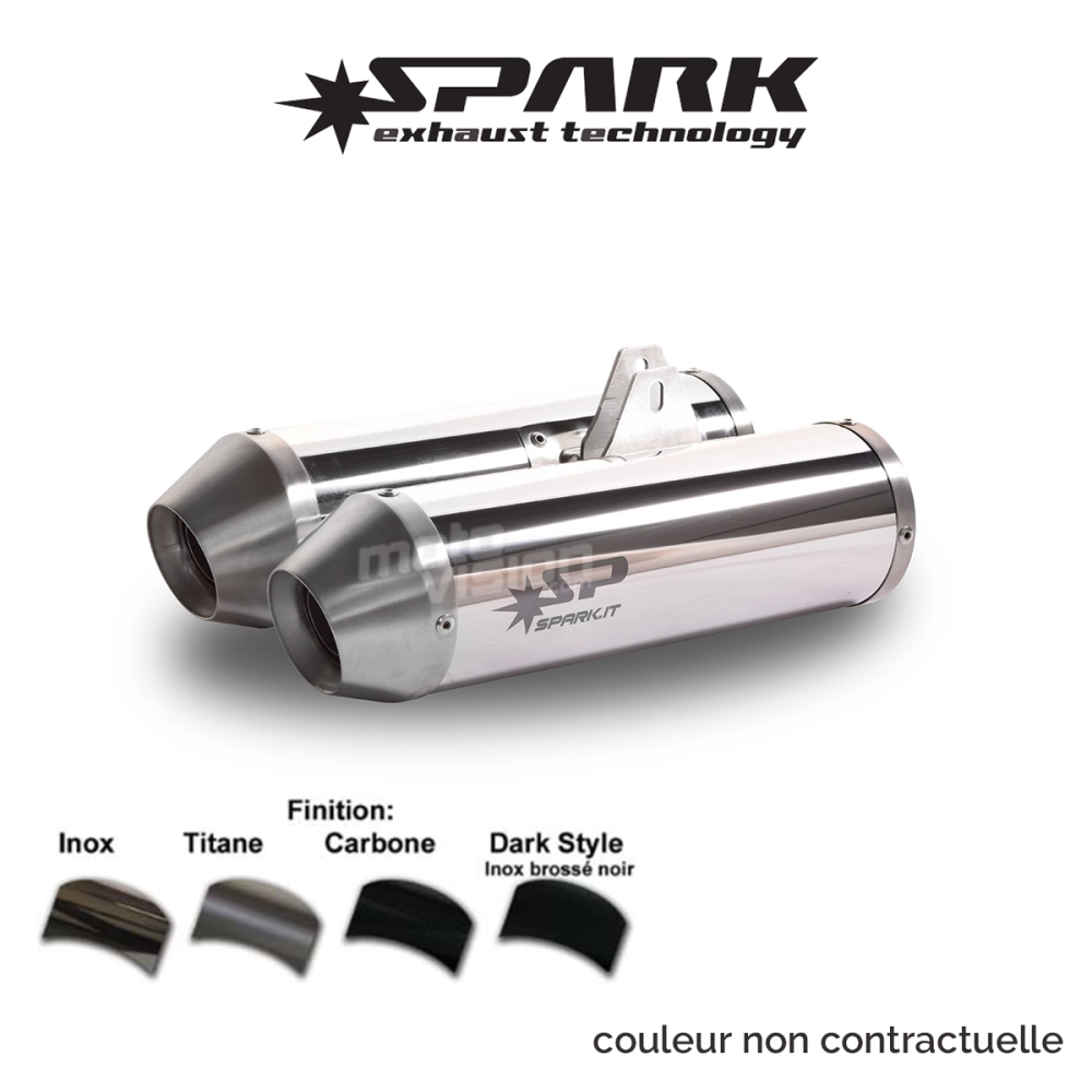 The different exhaust types are specifically designed for each motorcycle model to best preserve its original design. The shape and position of Spark silencers, the collector assembly parts, and many other details are engineered to enhance the styling and performance of each model. Exhaust finishes are available in stainless steel, titanium, carbon, and dark style (brushed black stainless steel).