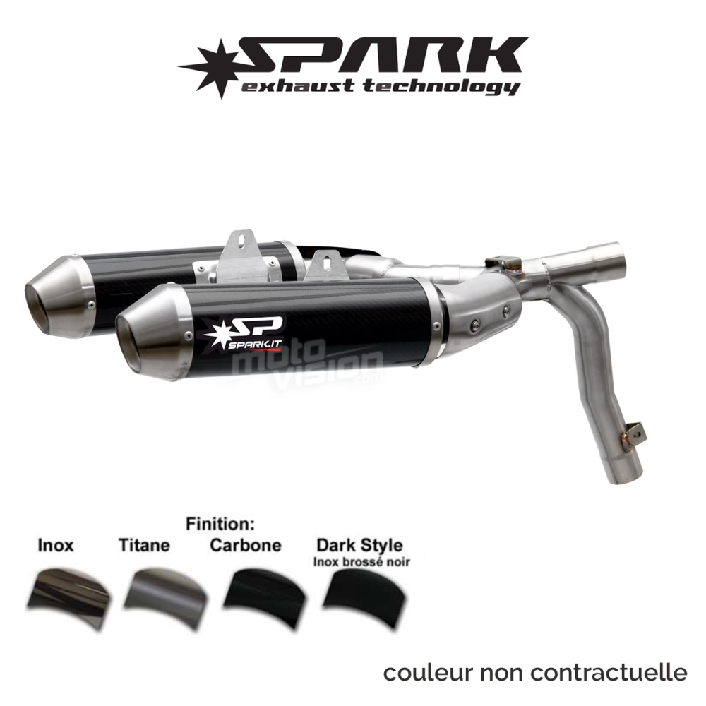Each exhaust system is specifically designed for each motorcycle model to preserve its original design as much as possible. The shape and position of Spark silencers, the collector assembly components, and many fine details are engineered to enhance both the styling and performance of every model. Exhaust finishes are available in stainless steel, titanium, carbon, and dark style (brushed black stainless steel).