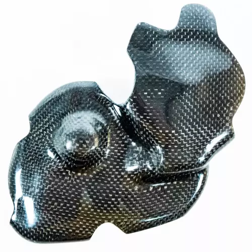 Starter cover carbone Sebimoto Kawasaki ZX6R 2006 2007 with a varnished finish that leaves the material weave visible. It is made up of 7 layers of carbon or braided carbon and Kevlar.