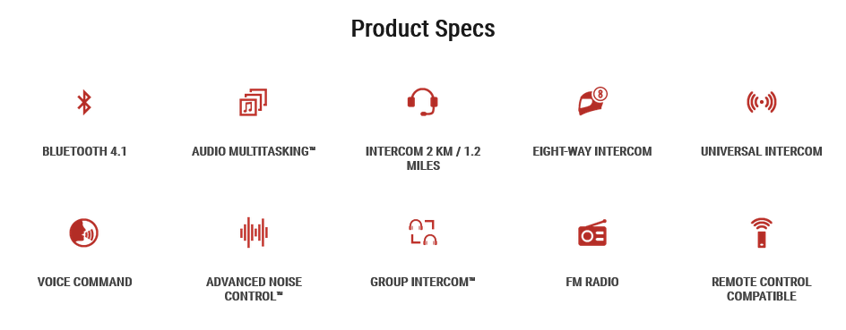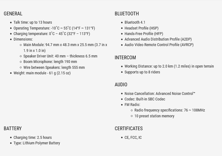 - Bluetooth 4.1 - FM radio - Audio Multitasking™ - Advanced noise control™ - 2 km range - Mesh Intercom™ - Eight-way intercom