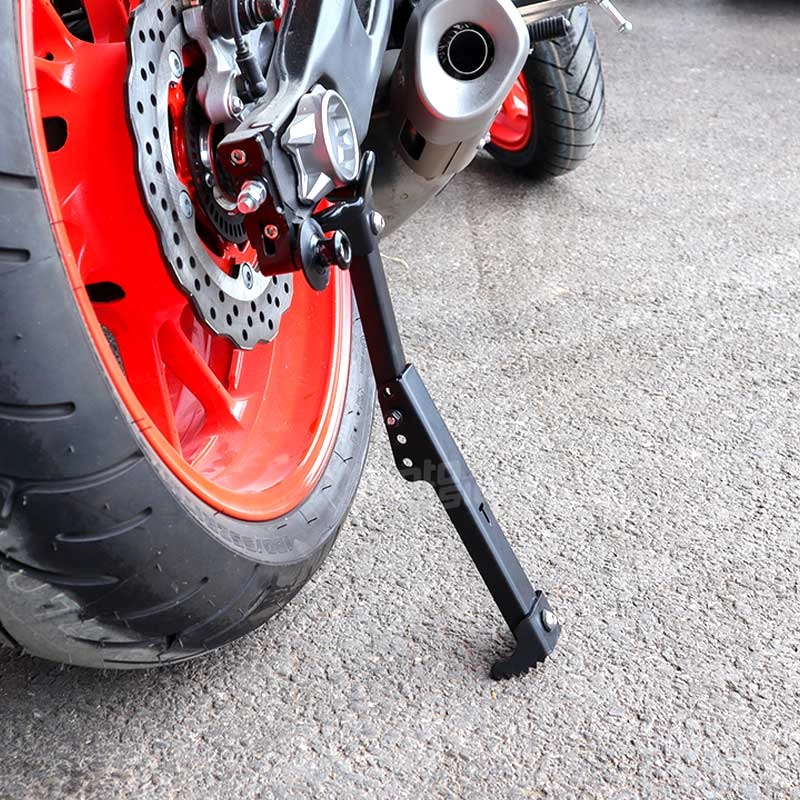 This wheel lifter is effective in many situations. From the simple greasing of your chain, to changing the tension of your chain, this tool is an essential to slip into your bag or your top case. It weighs less than 700gr and is 22cm long.