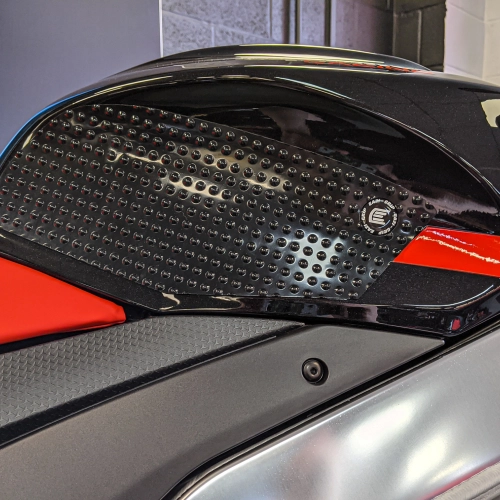 Adhesive and non-slip motorbike tank grip from the Evo range by Eazi-grip, pre-cut specifically for APRILIA RSV4 / TUONO V4 2021+. The product is designed to give you better control of your motorbike when accelerating or braking, while reducing fatigue.Sold in pairs onlyColour: clear. Grips also available in black.PRO range: Grip made up of small hemispherical domes offering a smoother surface for greater freedom of movement and less wear than the EVO range.The advantages of Eazi-Grip motorbike tank gripsEvo avec grossissement image-1024x685Working closely with feedback from professional riders, the Eazi grip tank grip has evolved to the stage where it is now a first choice product in the paddock.Launched in 2011, it consists of domes that offer high levels of grip. Today the brand offers two main ranges. EVO tank grips: These grips have a textured surface that offers both excellent grip and exceptional sensations for the rider. PRO tank grips: The grips are designed to allow greater freedom of movement while offering high levels of grip when required, particularly during heavy braking.Why install motorbike tank grips?This simple, effective system helps the rider to remain stable when leaning on the bike for long periods in corners or when braking hard.By gripping the bike with their legs, riders tire much less, which means they can handle their bikes better during sessions on the track, whether as amateurs or in competition.The tank grip can be stuck to any surface (rough or painted, metal or plastic), plus it's completely transparent (for the transparent version) so the paintwork is 100% visible.Delivered pre-cut (specific to each motorbike model). Each model is available in transparent or black.Find out more about the Eazi-grip range of protectionsEazi-Grip Racing Products, designs, manufactures and distributes a range of motorbike performance and protection products worldwide. Eazi-Grip? is now recognised as Europe's leading brand of motorbike tank protection grips and are approved by professional teams in British Superbikes, World Superbikes, Australian Superbikes, MotoAmerica, Moto2 and Moto3.But Eazi-grip isn't just known for its tank grips. Silicone hose kits and dashboard screen protectors are also developed and approved by the world's leading racing teams. The brand currently has over 100 motorbike models and is always working hard to improve and expand its product range to satisfy as many motorcyclists as possible.