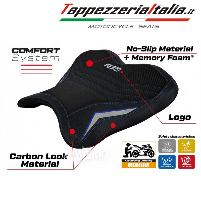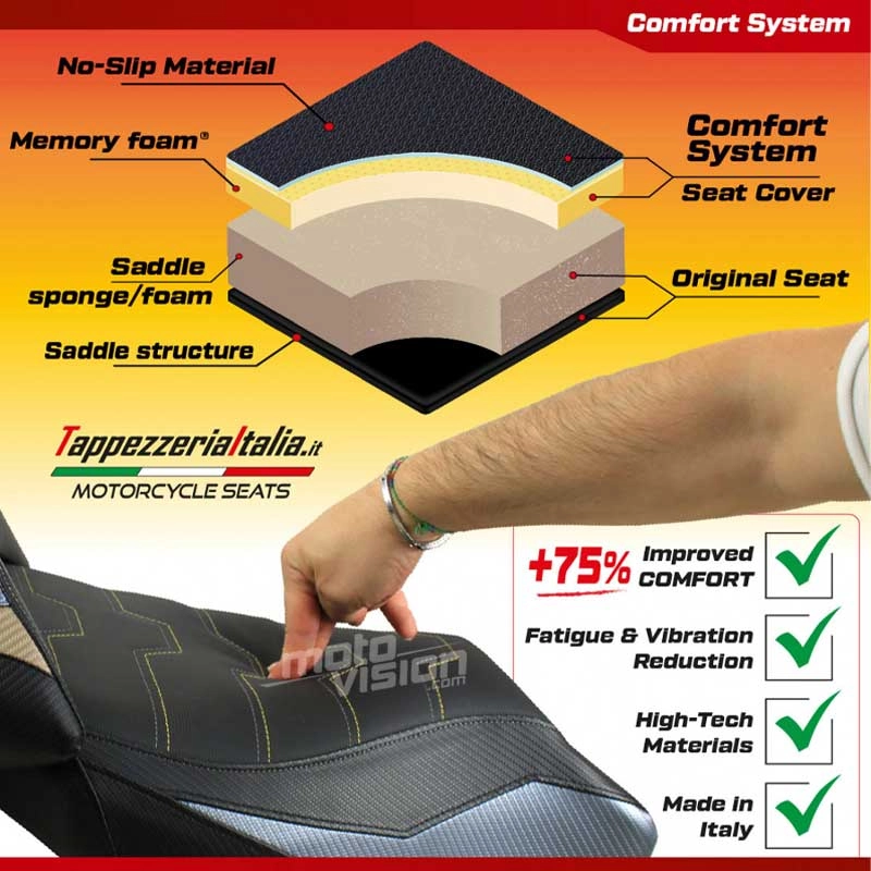 - Comfort system: This cover is on the outside exactly the same as all other covers, but is coupled on the inside with a special 2.5 cm layer of memory foam. Tappezzeria Italia is the only manufacturer to use Memory Foam technology, which improves riding comfort by reducing fatigue and vibration of the bike.