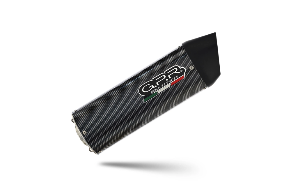 GPR's Furore Poppy silencer has a carbon look, stainless body and has been developed with a production process that produces zero impact to the environment. It has an oval shape with a diameter of 120MM, with avional bottoms produced by CNC machining.This kit includes the specific lnik pipe or half-manifold with specific appropriate brackets and accessories. This allows for installation without any structural modifications.This is an original GPR product, developed after GPR's experience in the World Championship. It offers an innovative design, improved performance, weight savings and a full-bodied sound.Weight : 1,84 Kg