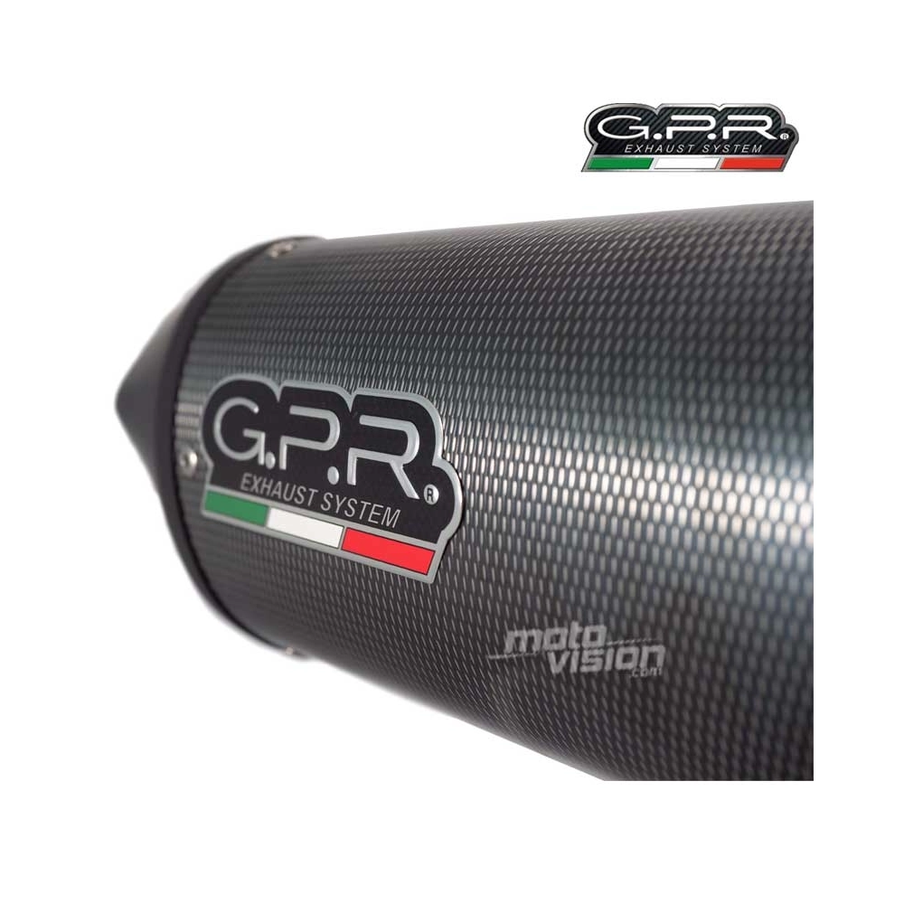 GPR's Furore Poppy silencer has a carbon look, stainless body and has been developed with a production process that produces zero impact to the environment. It has an oval shape with a diameter of 120MM, with avional bottoms produced by CNC machining.This kit includes the specific lnik pipe or half-manifold with specific appropriate brackets and accessories. This allows for installation without any structural modifications.This is an original GPR product, developed after GPR's experience in the World Championship. It offers an innovative design, improved performance, weight savings and a full-bodied sound.Weight : 1,65 Kg