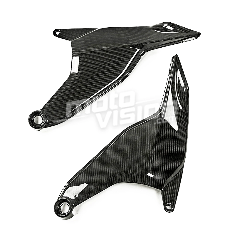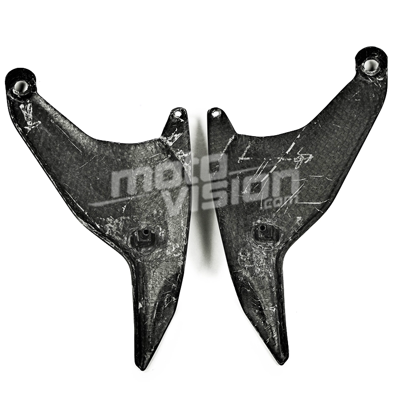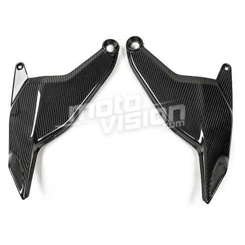 Seat side panels Carbone Ducati Diavel V4 2023- , delivered without screws or other fixings. The holes are already drilled on the carbon motorbike fairings. The parts are available in glossy or matt varnish.