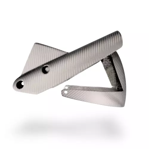 Easily recognisable by its very fine, tight weave, which makes it highly resistant to impact. The film is then placed in a mould with thermosetting polymer resin. As it dries, the carbon takes on its final shape, producing an aesthetic effect that is highly appreciated for its oblique lines.
