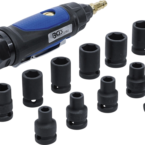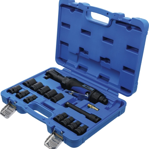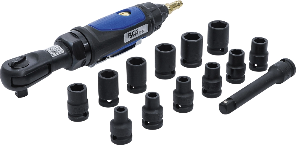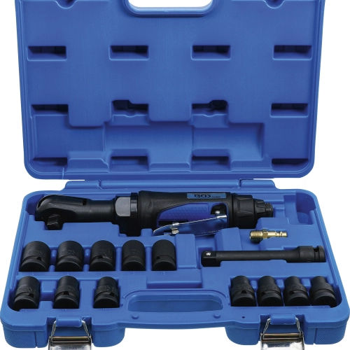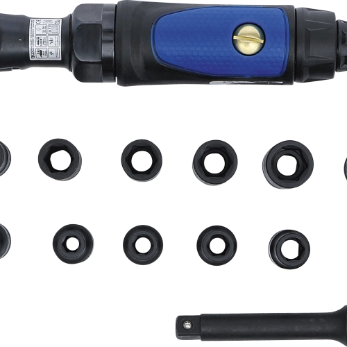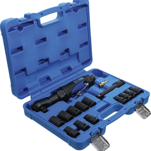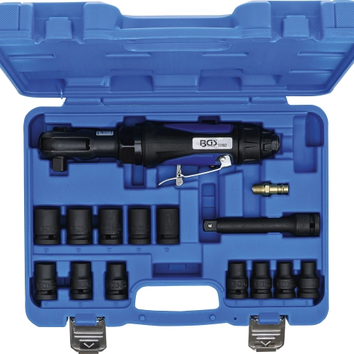 Compressed-air ratchet screwdriver set 12.5 mm (1/2") 102 Nm consisting of 14 parts. The 12.5 (1/2) 102 Nm compressed air ratchet comes complete with 12 impact sockets from 8" to 19" and an extension.