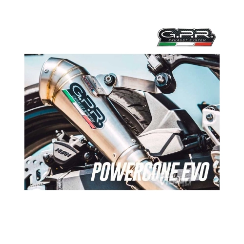 GPR's Powercone Evo exhausts are directly from the races with a super sporty look and cone shape. They are made of hand-brushed 304 stainless steel, with visible TIG welds on the cone. Their cone shape has a diameter of 70MM x 110MM.This kit includes the specific lnik pipe or half-manifold with specific appropriate brackets and accessories. This allows for installation without any structural modifications.This is an original GPR product, developed after GPR's experience in the World Championship. It offers an innovative design, improved performance, weight savings and a full-bodied sound.Weight : 1,95 Kg