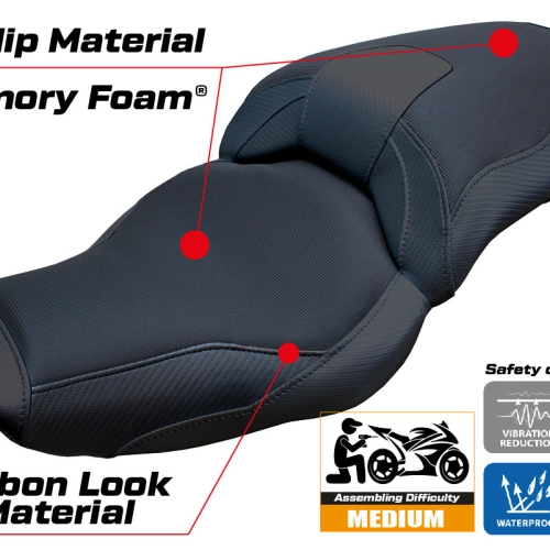 Designed to provide maximum comfort while riding, each Tappezzeria product is made of an exclusive padding, manufactured in black anti-slip material, with a black carbon look and different colours of inserts.