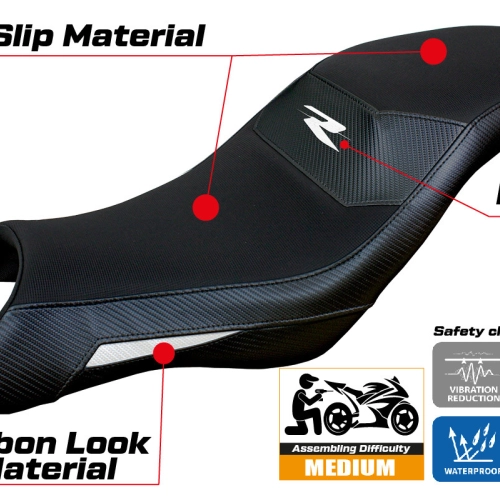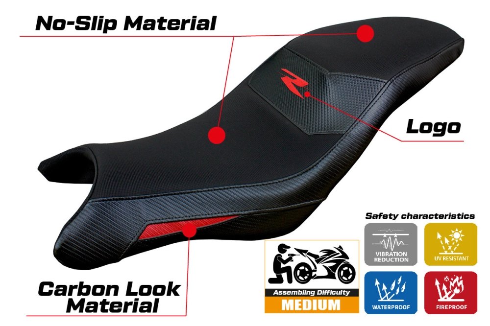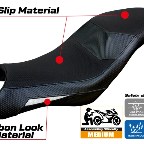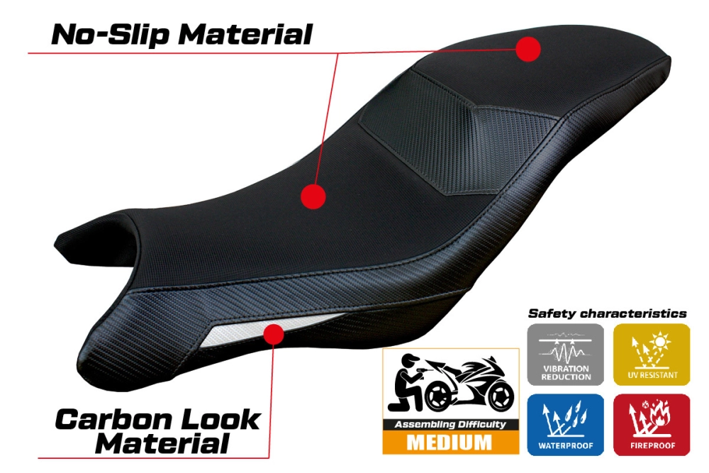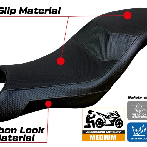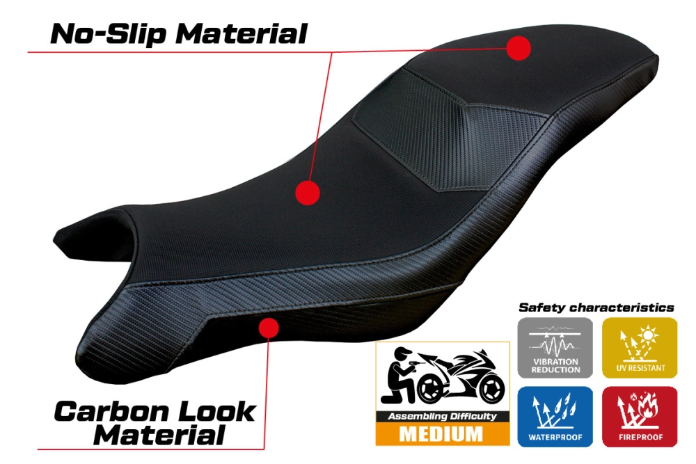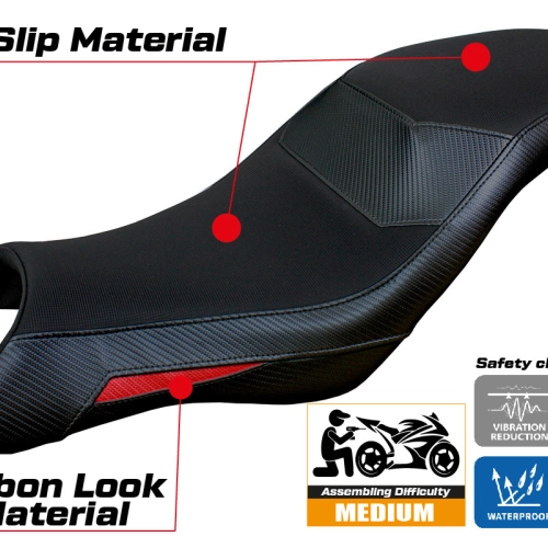 Designed to provide maximum comfort while riding, each Tappezzeria product is made of an exclusive padding, manufactured in black anti-slip material, with a black carbon look and different colours of inserts.