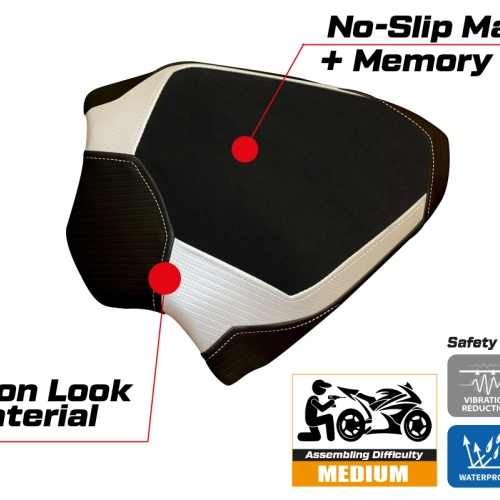 The Couvre selle passager pour Ducati Panigale V4 (18-24) modèle Rivoli 1 comfort system allows you to easily change the look of your original motorbike seat. It has the essential technical features for a quality motorbike seat cover: waterproof and sun resistant, reinforced double stitched seams and high resistance to chemicals.