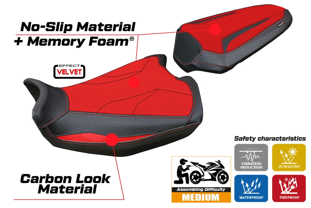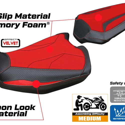 Designed to provide maximum comfort while riding, each Tappezzeria product is made of an exclusive padding, manufactured in black anti-slip material, with a black carbon look and different colours of inserts.