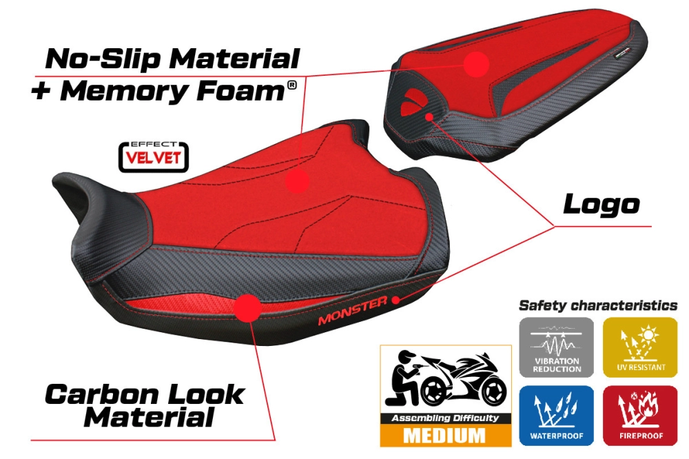 The Couvre selle Tappezzeria Ducati Monster 937-950 (21-24) modèle Linosa Velvet Comfort System allows you to easily change the look of your original motorbike seat. It has the essential technical features for a quality motorbike seat cover: waterproof and sun resistant, reinforced double stitched seams and high resistance to chemicals.