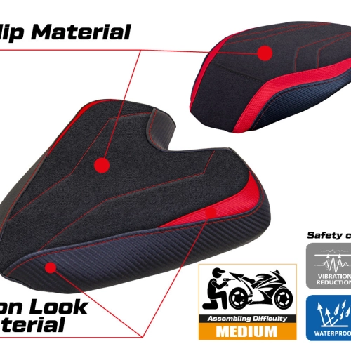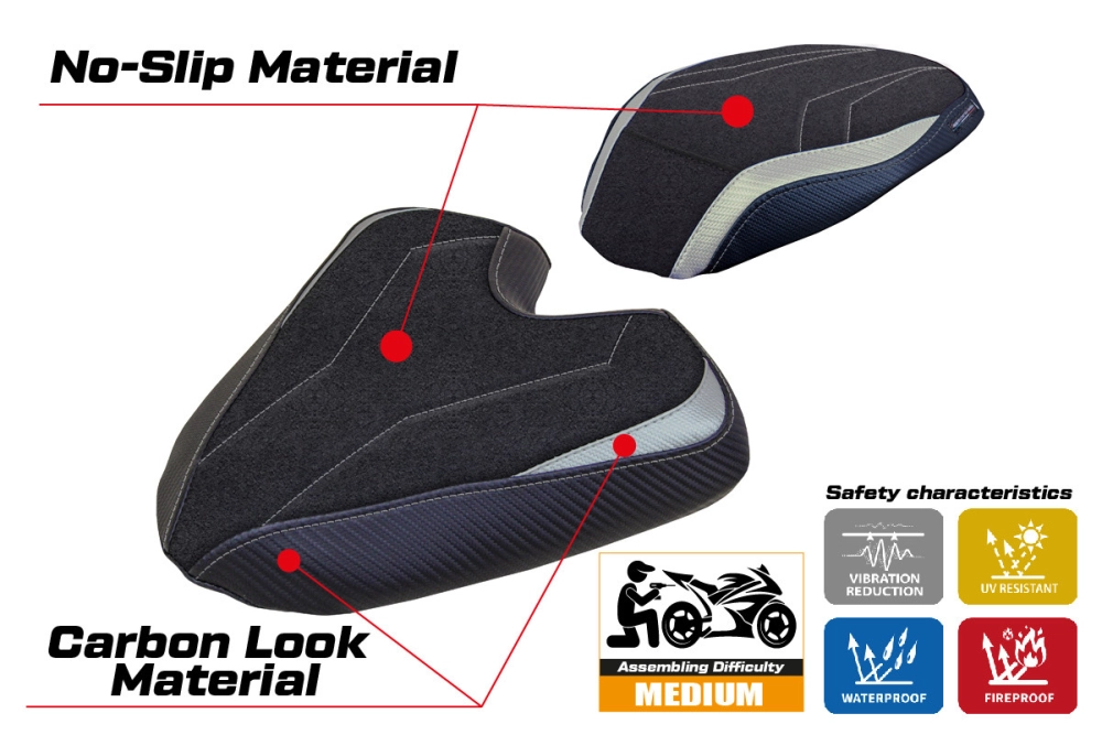 Designed to provide maximum comfort while riding, each Tappezzeria product is made of an exclusive padding, manufactured in black anti-slip material, with a black carbon look and different colours of inserts.