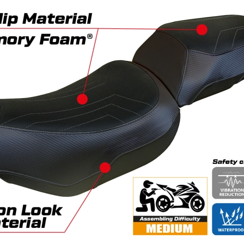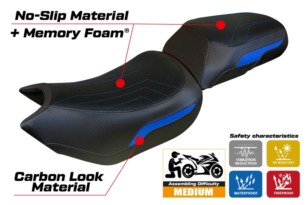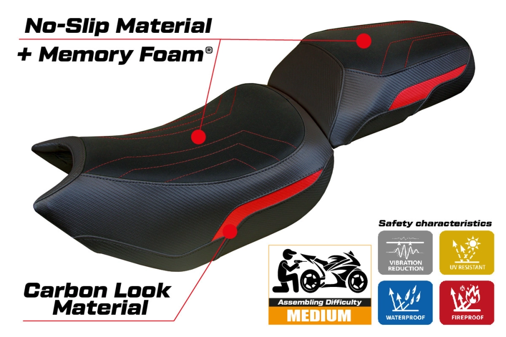 Designed to provide maximum comfort while riding, each Tappezzeria product is made of an exclusive padding, manufactured in black anti-slip material, with a black carbon look and different colours of inserts.