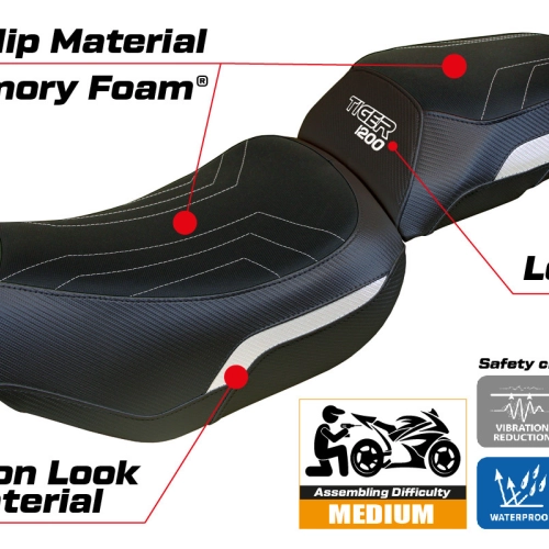 The Couvre selle Tappezzeria Triumph Tiger 1200 (22-24) modèle Wales Comfort System allows you to easily change the look of your original motorbike seat. It has the essential technical features for a quality motorbike seat cover: waterproof and sun resistant, reinforced double stitched seams and high resistance to chemicals.