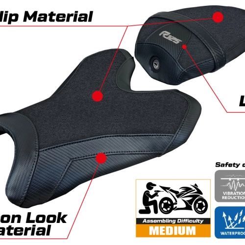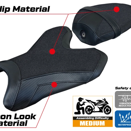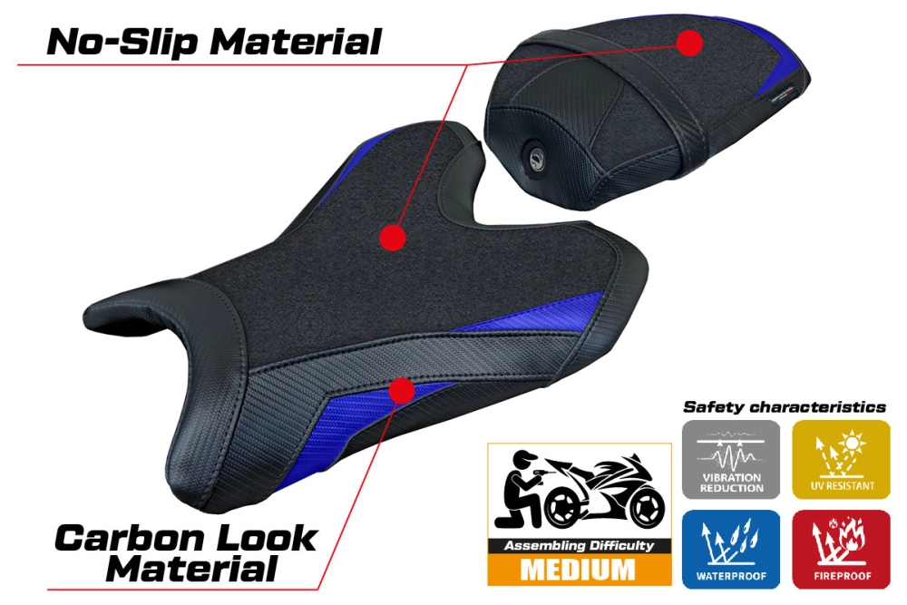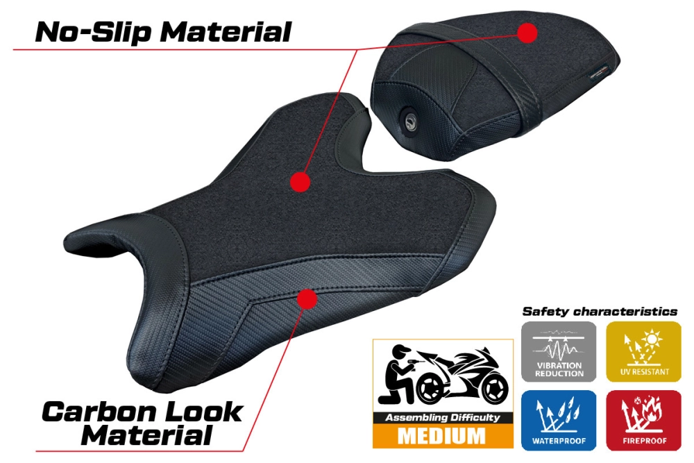 Designed to provide maximum comfort while riding, each Tappezzeria product is made of an exclusive padding, manufactured in black anti-slip material, with a black carbon look and different colours of inserts.