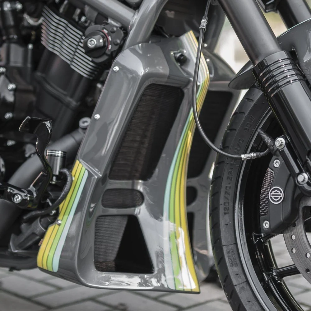 The "Indy" radiator cover by Killer Custom is designed for all Harley-Davidson V-Rod models, giving your bike the respect it deserves. This radiator cover is hand-laid fiberglass. It fits perfectly and the kit includes all necessary mounting hardware as well as a black mesh grille.