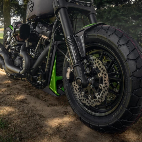 The new exclusive grooved lower fork caps. The entire fork appears smooth, as the chrome fork tubes are fully covered. Your fork will have a completely black look and give your Fat Bob a whole new style. These caps fit both the original front fender and any custom fender.