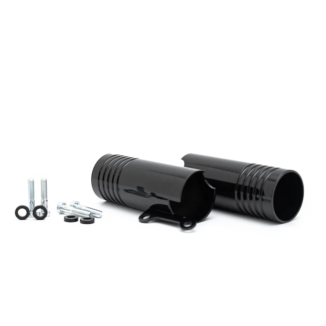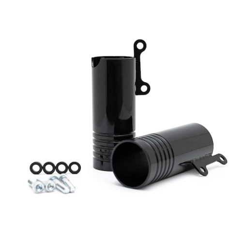 The caps are mounted to the front fender (compatible with the stock fender) and to the brake caliper for a secure fit. Finished in high-gloss black powder coat!