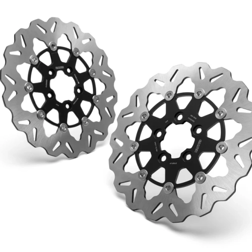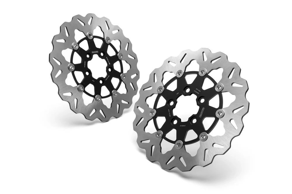 We only sell the best high-performance brake discs, made from laser-cut, double-ground, high carbon 420 stainless steel. These direct replacement discs fit like the originals, featuring a fully floating design and an aluminum center for improved brake feel and control. The WAVE® design cools the discs as they spin, reducing operating temperatures, and the self-cleaning function helps remove water. Individually heat-treated and lighter than the original, this disc design resists warping and ensures optimal performance under extreme conditions.