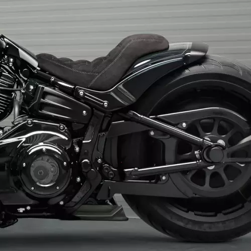 Introducing our new “Avenger” collection and unique rear fender for Harley-Davidson M8 Softail FXDR, Breakout, and Fat Boy models. The “Avenger” fender comes with integrated taillights and turn signals. It also features built-in struts, allowing it to be used with both solo and 2-up seats. A matching solo seat pan is included. Custom matching seats can be ordered separately if you're looking for a fully personalized rear-end style. Fits rear tires from 240 to 260 mm.