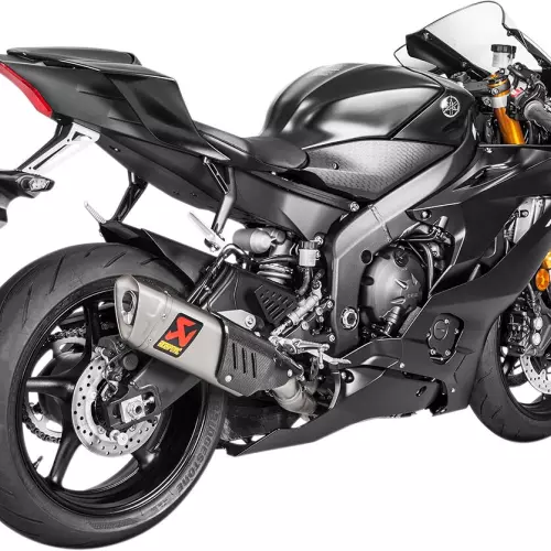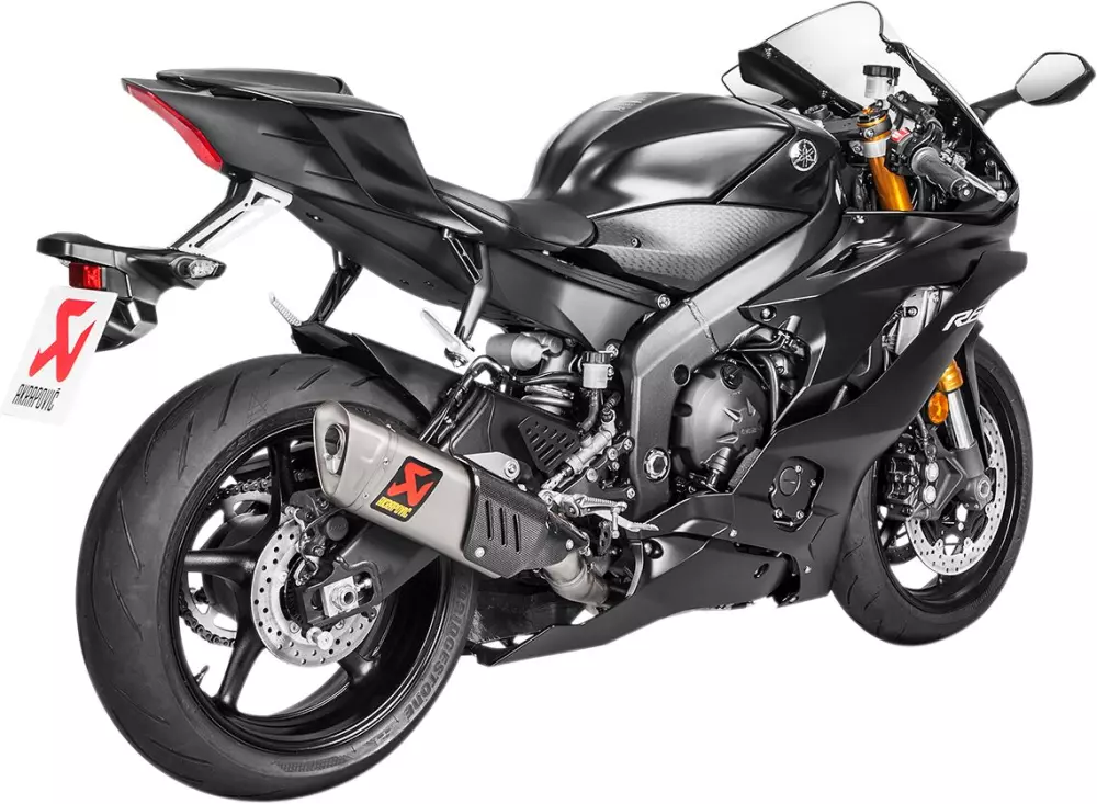 Akrapovic Racing Line Exhaust System for YAMAHA YZF-R6 08-25. When the exhaust system position needs to be changed and the original mounting bracket can no longer be used, a carbon fiber mounting bracket is included. Perforated inner sleeve with titanium outlet and inlet cap. The inlet cap gasket is CNC machined with state-of-the-art technology and connected by high-quality silicone reinforced springs. Includes a compact and lightweight high-temperature resistant carbon fiber exhaust strap. Conical and hydroformed stainless steel header; Crossover pipes can be installed on some models. The connection can be cylindrical and, on some models, made of titanium; the construction type is based on maximum performance increase.