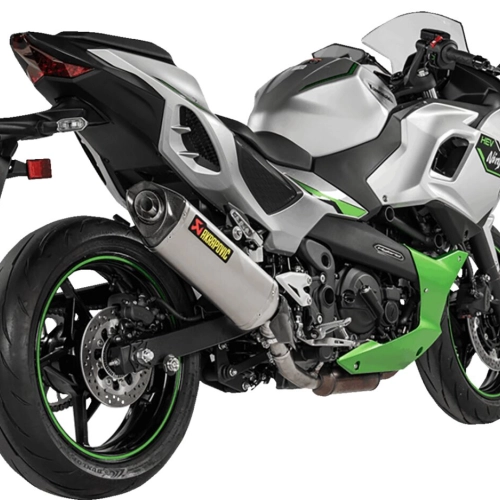 Akrapovic slip-on silencer for KAWASAKI Ninja 7/Z7 Hybrid 24. Focusing on aesthetics, a specific sound and reduced weight, this titanium silencer has a surface coating that strengthens it and ensures its longevity. Produces a deep sound and weighs 42.2% (1.8 kg) less than the standard original silencer. The carbon fiber end cap and heat shield accentuate the elegance and are complemented by a stainless steel link pipe and interior. This exhaust provides, in addition to improved throttle response, an increase of 0.8 kW (1.1 hp) in power at 7,900 rpm and 1 Nm in torque at 8,000 rpm according to comparison tests with a standard original exhaust. Quick installation, without changing the mapping.