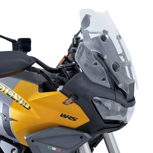 Moto Guzzi WRS Sport Windscreen with high-quality Stelvio radar, 4 mm thick. Thanks to this Windscreen, annoying turbulence on the helmet and shoulders is eliminated, ensuring optimal protection even on long journeys. Even the passenger enjoys the maximum comfort offered by the increased protection of the Touring fairing. The design, studied down to the smallest detail, integrates perfectly with the line of the motorcycle and gives it an even more attractive look. Windscreen for motorcycles equipped with radar.