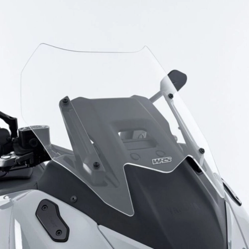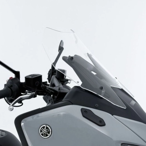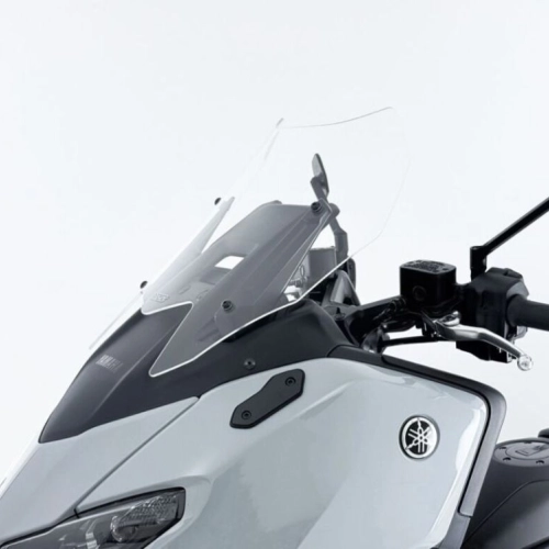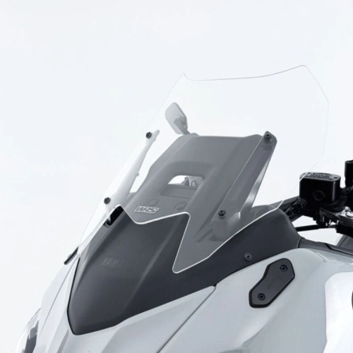 WRS Intermedio Yamaha T-MAX TECHMAX Transparent Windscreen, made of high quality PMMA plexiglass, 3 mm thick. Even the passenger enjoys the maximum comfort offered by the increased protection of the Touring fairing. Thanks to this Windscreen, annoying turbulence in the helmet area as well as air on the shoulders are eliminated, ensuring optimal protection even on long journeys. The design, studied down to the smallest detail, integrates perfectly with the line of the motorcycle and makes it even more attractive.