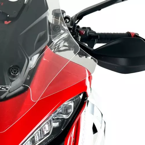 Ducati MULTISTRADA V4 Transparent Wind Deflectors, made of high-quality materials. Manufactured according to the strictest safety standards, respecting the craftsmanship, which guarantees maximum resistance and transparency. The installation of Ducati Side Wind Deflectors improves travel comfort, Ducati wind deflectors reducing air pressure on the shoulders and arms, to allow the rider to face long journeys in the greatest comfort.