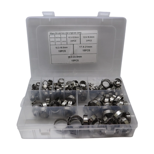 Assortment of 150 single-ear clamps in 304 stainless steel. For fuel/coolant/air lines and small hoses. Sizes Ø 5.8–23.5 mm. Crimp with pincers.