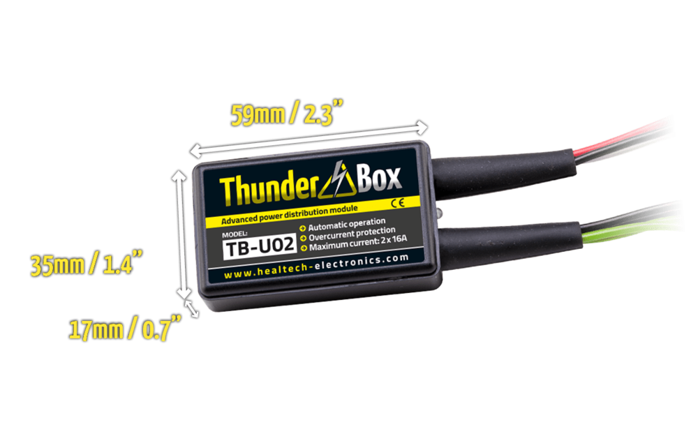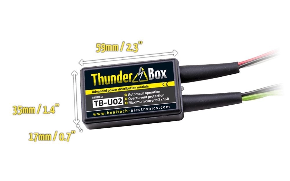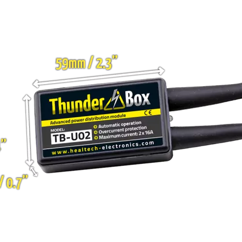 The advanced electric power distribution module ThunderBox 2X16A Healtech is the practical solution for connecting the electrical accessories on your motorcycle (additional running lights, heated grips, GPS, phone charger, gauge, etc.)