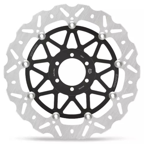 The brake disc is designed with an inner diameter of 64,0 mm, an outer diameter of 320 mm, a style of type floating, surface drilled, mounting (drilling) with 6 holes, thickness 5.0 mm, material: aluminum and stainless steel.