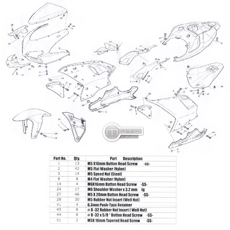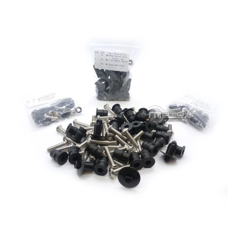 El kit contiene todos los tornillos, tuercas, arandelas, contratuercas, remaches, clips de plástico, etc. necesarios para montar un carenado ABS idéntico al original.