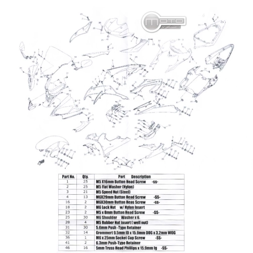 El kit contiene todos los tornillos, tuercas, arandelas, contratuercas, remaches, clips de plástico, etc. necesarios para montar un carenado ABS idéntico al original.