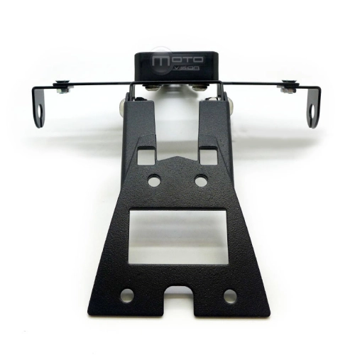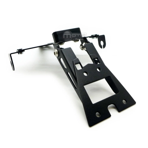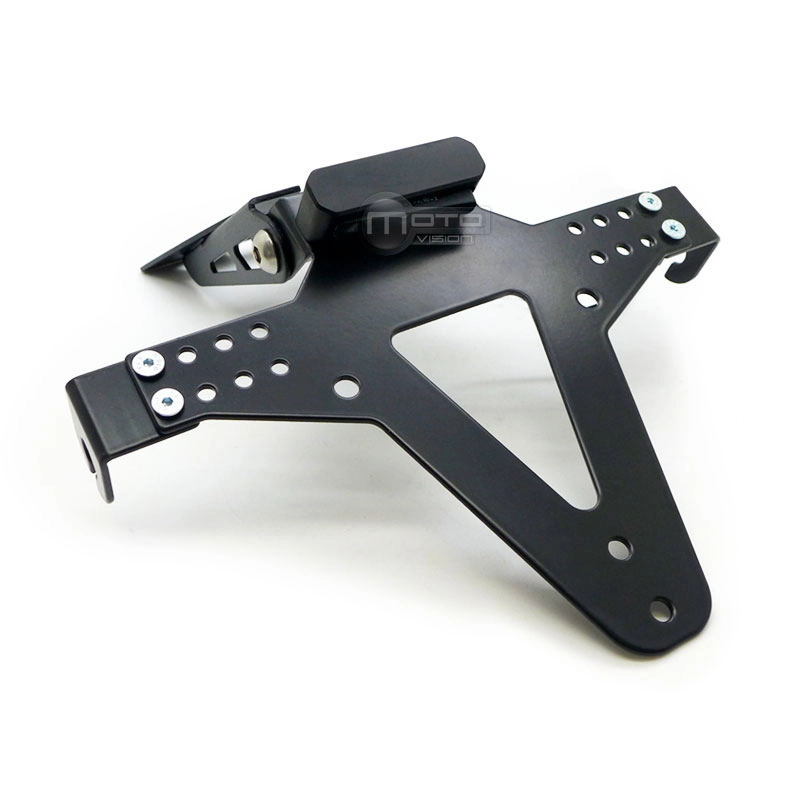 Soporte de matricula en aluminio regulable. Incluye adaptador para cada moto, tornillería y fijaciones.