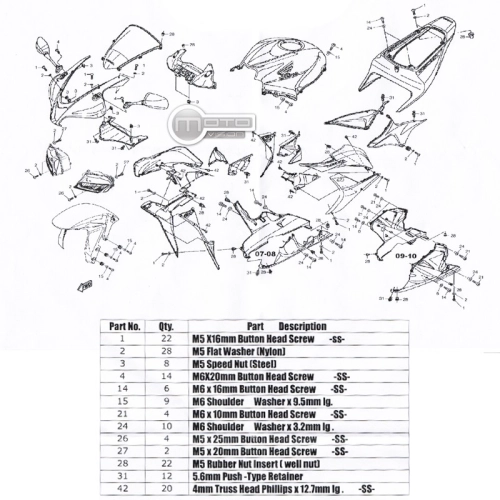El kit contiene todos los tornillos, tuercas, arandelas, contratuercas, remaches, clips de plástico, etc. necesarios para montar un carenado ABS idéntico al original.