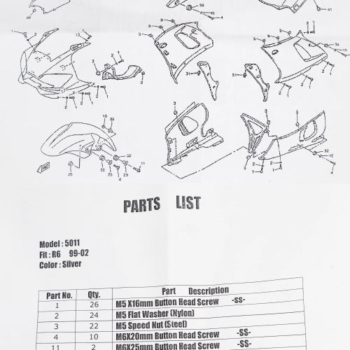 El kit contiene todos los tornillos, tuercas, arandelas, contratuercas, remaches, clips de plástico, etc. necesarios para montar un carenado ABS idéntico al original.