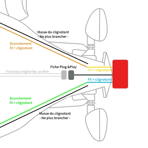 Luz homologada por la UE con los intermitentes aún en el montaje original. Los indicadores integrados son estéticamente agradables, pero no están cubiertos por la legislación. Para mantener la homologación del producto, la distancia de los intermitentes traseros, entre los bordes interiores de las dos zonas de iluminación, debe ser de un tamaño mínimo.