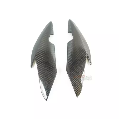 Cache sur écope radiateur carbone Triumph Speed Triple 2016, se entrega sin tornillos ni otras fijaciones. Los agujeros ya están perforados en los carenados de carbono de las motos. Las piezas están disponibles en barniz brillante o mate.