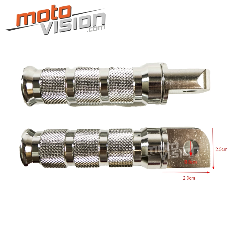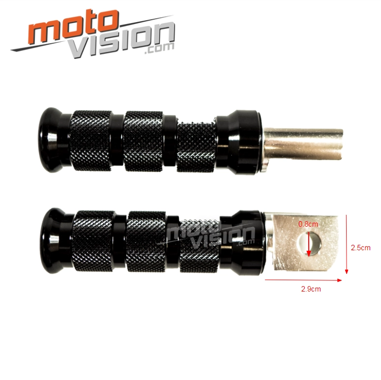 Gracias a su diseño compacto y preciso, se adaptan fácilmente a las fijaciones previstas en ciertos modelos Honda, con una base de 2,9 cm de longitud, 2,5 cm de altura y un diámetro de fijación de 0,8 cm. La instalación es rápida y no requiere ninguna modificación importante, proporcionando una solución simple y eficaz para reemplazar o actualizar sus estriberas originales. Compruebe la compatibilidad con su moto comparando las medidas directamente en su vehículo.