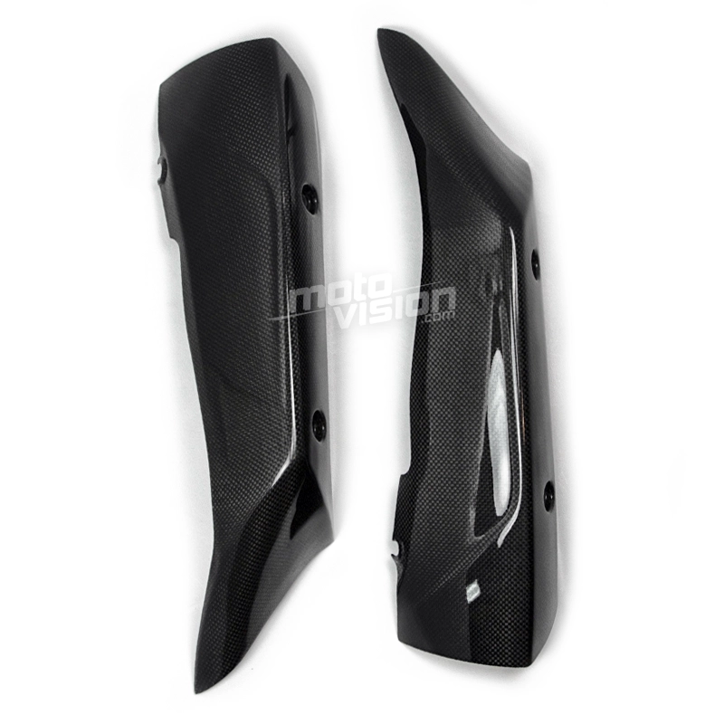 Par de protectores de escape Yamaha YZF R1 2009-2011 que se monta directamente en los puntos de fijación originales de su moto para sustituir el carenado original. Las piezas de carbono se entregan sin tornillos ni pernos.