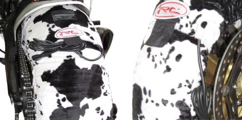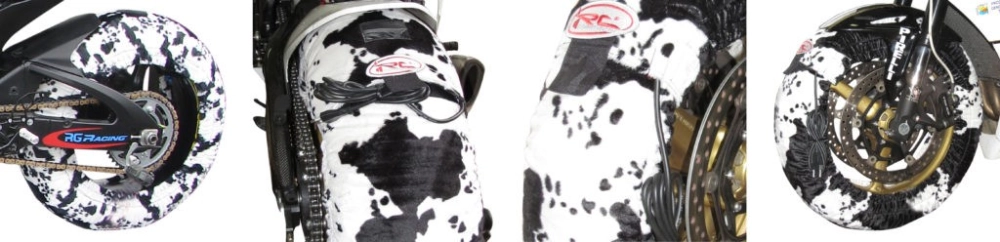 Ein Paar IRC-Motorradreifenwärmer mit dem Motiv "Animal Cow", die bei 80°C selbstregulierend sind und in den Größen XL und XXL erhältlich sind. Diese CE-zugelassenen Motorradreifenwärmer wurden speziell entwickelt, um Sie bei Motorradfahrten sowohl im Fahrerlager als auch auf der Rennstrecke aus der Masse hervorstechen zu lassen.