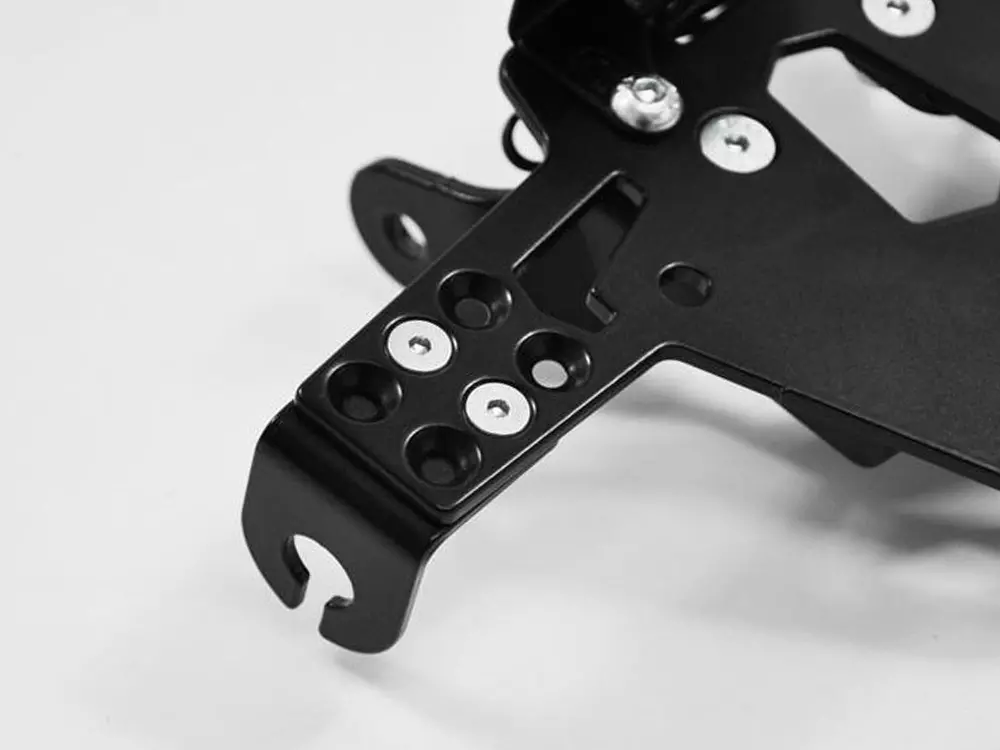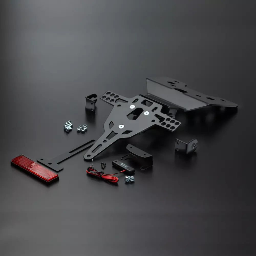 Soporte de matricula en aluminio regulable. Incluye adaptador para cada moto, tornillería y fijaciones.