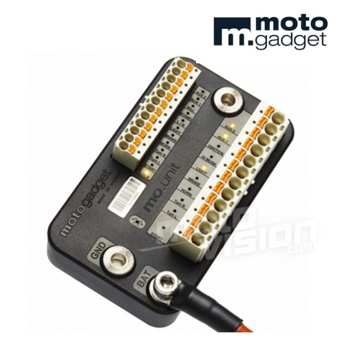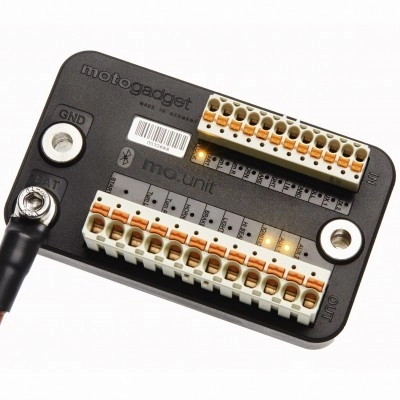 El nuevo mo.unit blue ha pasado de la versión anterior establecida mediante un desarrollo y mejoras importantes. Ahora está equipado con 12 entradas y 10 salidas, abrazaderas de cable reemplazables de alta calidad y, sobre todo, Bluetooth® LE. Esto permite que mo.unit blue se conecte a nuestra aplicación para teléfonos inteligentes "mo.ride". Esta característica es única para los accesorios de motocicletas.