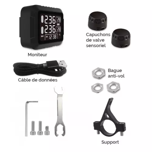 Se instala en pocos minutos. Basta con colocar los tapones suministrados en las válvulas de los neumáticos y listo. La caja TPMS se enciende automáticamente en cuanto la moto se pone en marcha, lo que garantiza un control constante de la presión de los neumáticos. Además, es fácil de recargar mediante un cable USB.