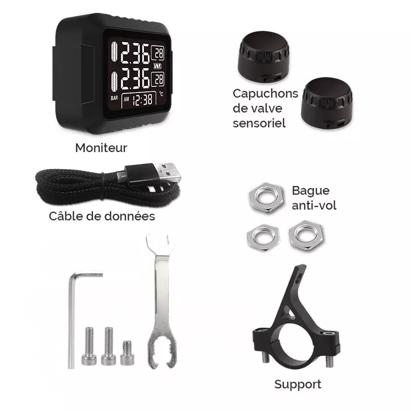 Diseñado para soportar todo tipo de terrenos, el sistema TPMS de control de presión y temperatura de los neumáticos de la moto es impermeable (Waterproof IP5K4K), resiste el barro, las altas temperaturas y el frío extremo. Sean cuales sean las condiciones meteorológicas, su seguridad es nuestra prioridad. Además, con la opción de medir la temperatura en grados Celsius o Fahrenheit, esta solución para controlar los neumáticos de su moto puede adaptarse a sus preferencias.
