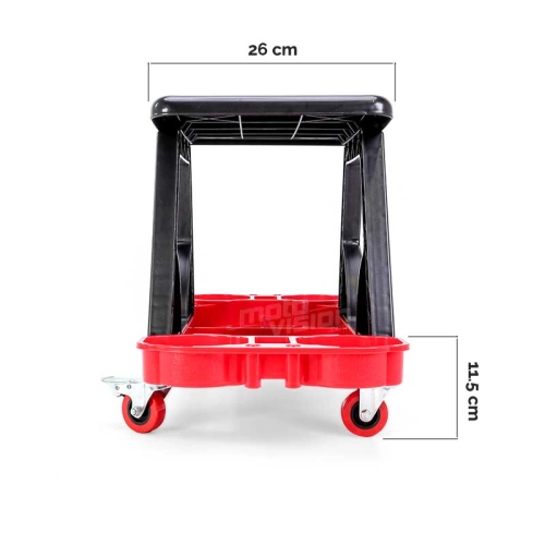 Make your work on your motorbike more comfortable with this stool on wheels and its storage bin for your small parts.